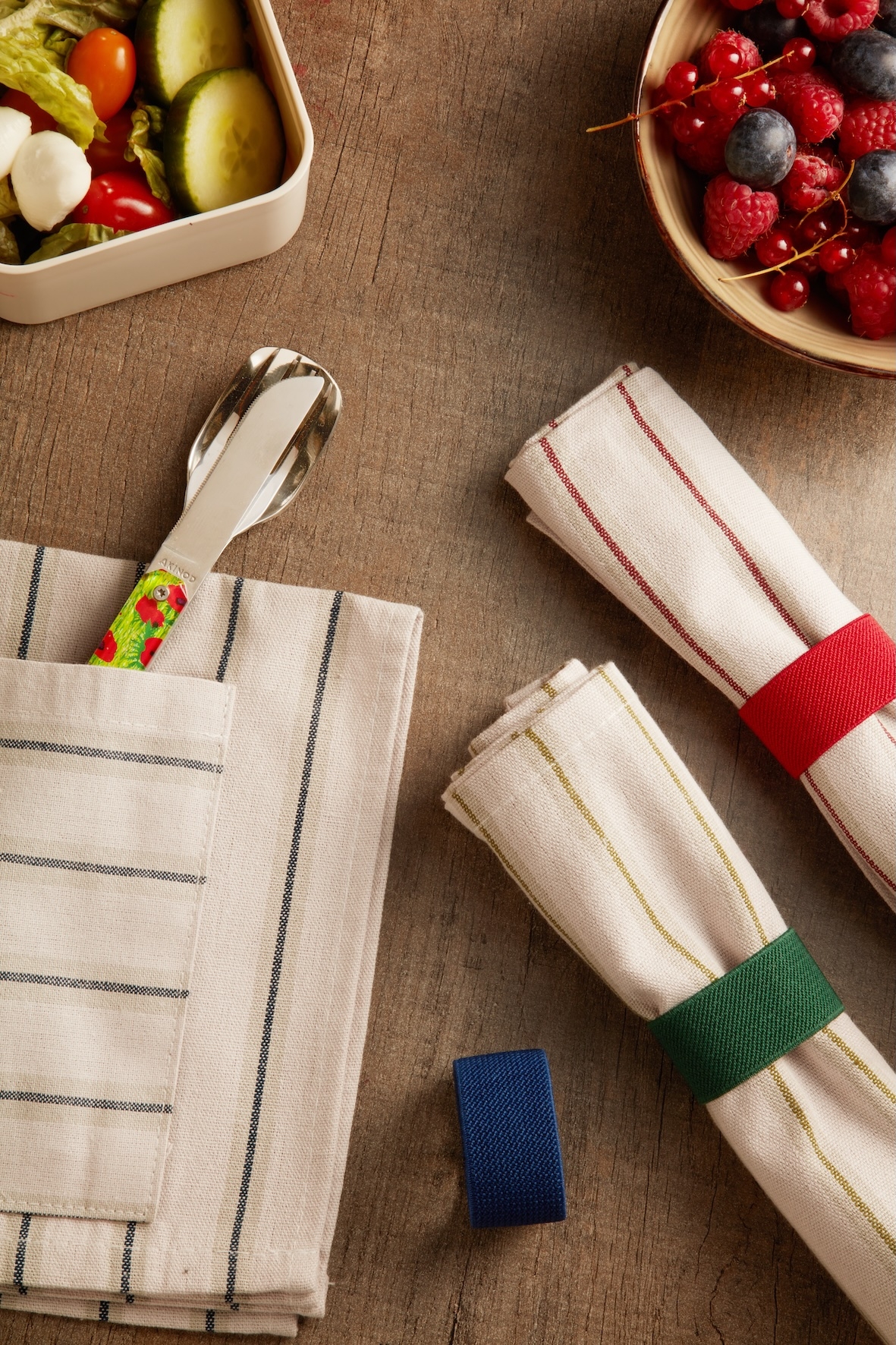 Akinod lance également un wrap de transport, une serviette dotée d’une poche cousue qui permet de glisser les couverts à l’intérieur avant d’être repliée et roulée, puis maintenue avec l’élastique tissé prévue à cet effet.