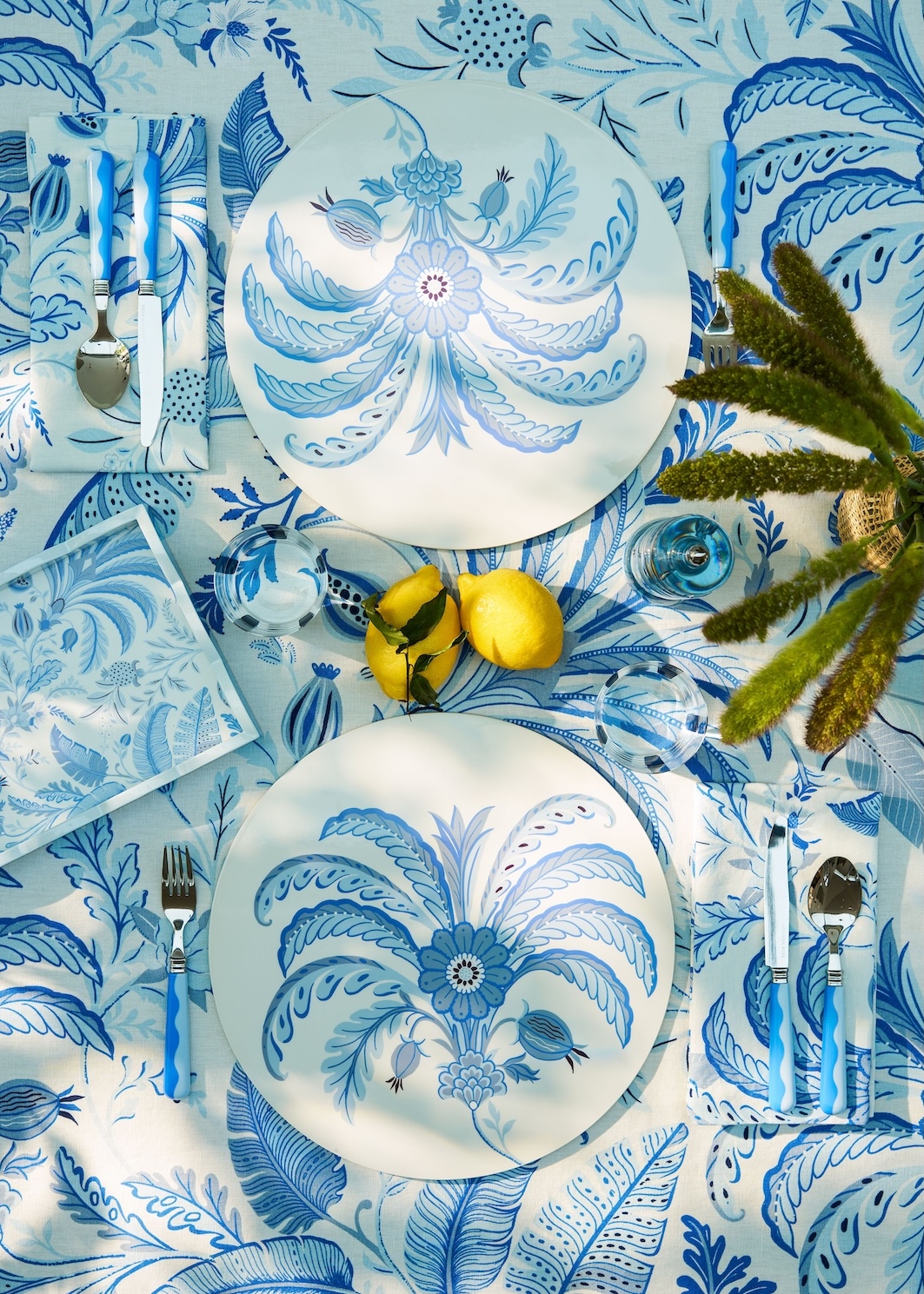 Voyageurs et passionnés de design, David et Sarah Ross ont puisé leur inspiration lors d'un séjour à Palm Beach pour les fêtes de fin d'année. Ils ont traduit la végétation locale (palmiers, feuillages tropicaux) et les teintes caractéristiques bleu, vert et rose en une collection qui se décline sur huit classiques de l’art de la table.