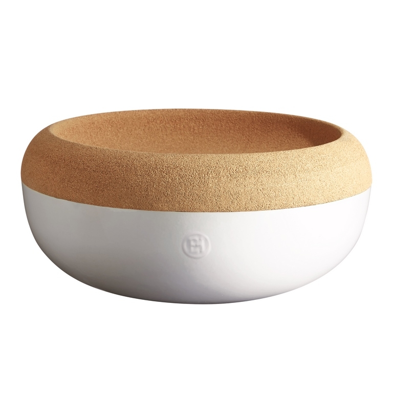 « Le concept de la coupe à fruits est née d’une réflexion autour de la conservation des fruits et légumes, explique Tania Clémente, designer associé et directrice artistique du studio La Racine. Comment conserver au mieux ses denrées alimentaires ? Inspirée du frigo du désert qui permet de maintenir les aliments au frais grâce au principe de refroidissement par évaporation, la céramique Émile Henry associée au liège semblait être un duo pertinent pour cet usage. Un objet qui devait allier praticité, pertinence d’usage et esthétisme. J’ai donc voulu à travers cette coupe, créer un objet généreux tout en courbes. L’idée était de créer une continuité dans le dessin de ses lignes afin de créer une harmonie entre ses deux matériaux issus de la nature. Un objet qui évoque le cocon, la protection, la conservation. »