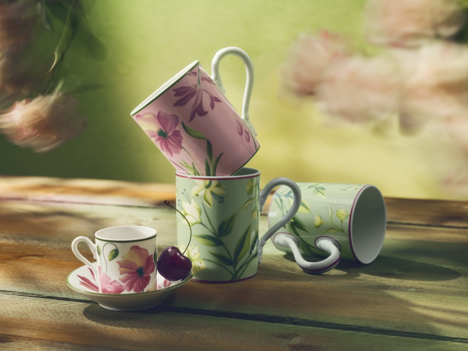 Sur le plan décoratif, Florenza associe des pièces aux couleurs marquées, qui couvrent largement les formes, et d’autres à fond blanc animées par un geste végétal plus minimaliste. Ce contraste confère à l’ensemble un rythme visuel souple et permet des compositions de table plus personnelles.
