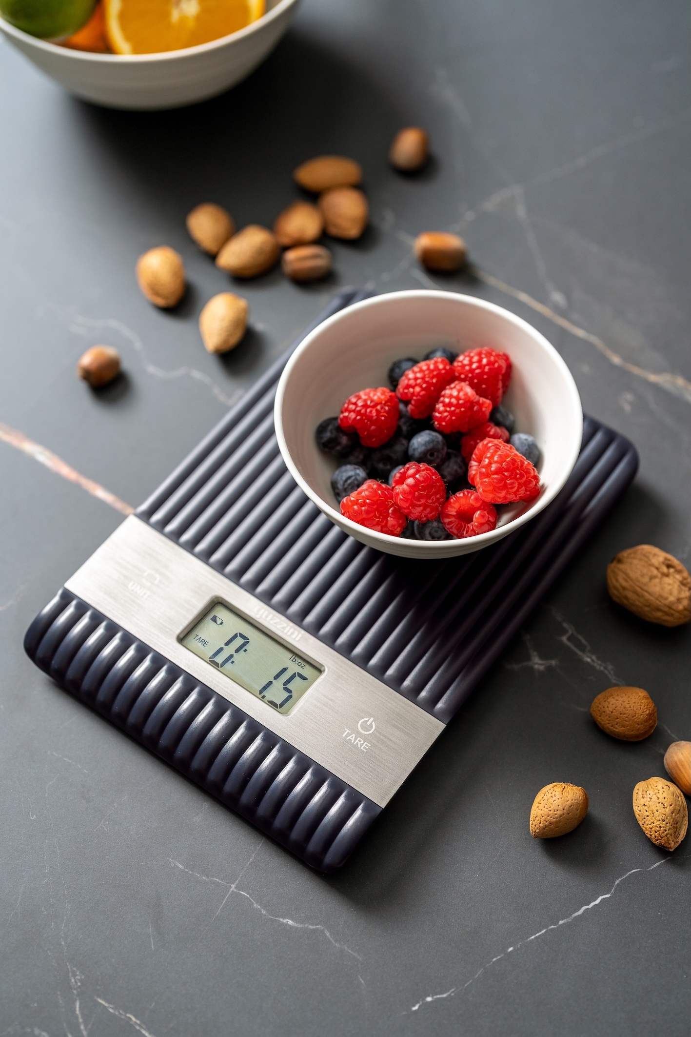 > balance (capacité 5 kg, précision 1 g, 4 unités de mesure, fonction tare).