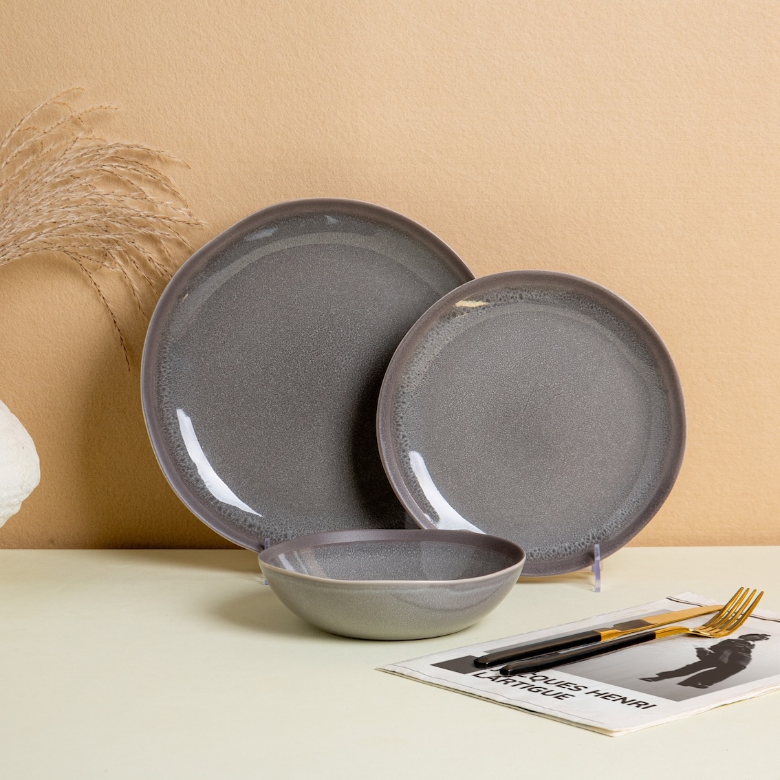 Deuxième axe de la catégorie, les services de table Osaka, Nagano et Tokyo. Ceux-ci se caractérisent par leur grès émaillé réactif et des tonalités profondes et minérales (vert aux reflets subtils, noir intense, nuances grises). Prix publics compris entre 259 € et 279 € le service 18 pièces.