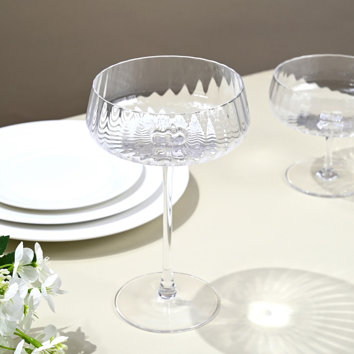 L’ensemble de la collection repose sur l’idée de faire de l’usage courant un espace d’expression du beau. Une vision qui s’illustre tout d’abord avec la verrerie qui valorise deux écritures complémentaires. La collection Cléo fait la part belle au cristallin soufflé bouche, travaillé avec un décor rainuré qui apporte du relief et de l’éclat, tout en jouant sur les variations de chaque pièce. La ligne regroupe des flûtes, des coupes à champagne, des verres à vin, à eau ou à orangeade. Prix public à partir de 65 € le lot de 2 flûtes 28 cl.
