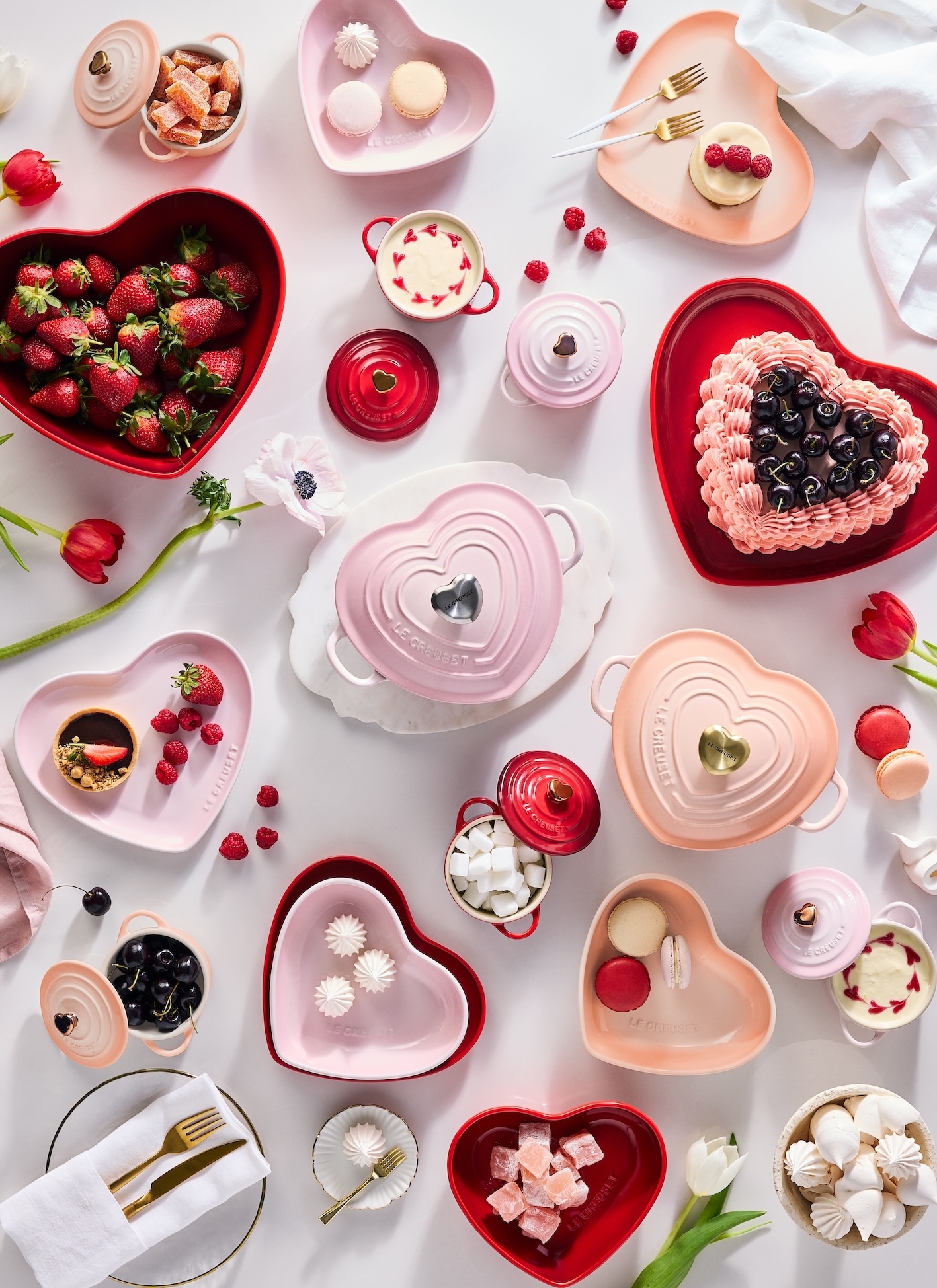 Pour cette saison, le spécialiste français de la fonte émaillé propose pêche, un nouveau coloris qui vient rehausser la palette de sa collection dédiée à la Saint-Valentin.