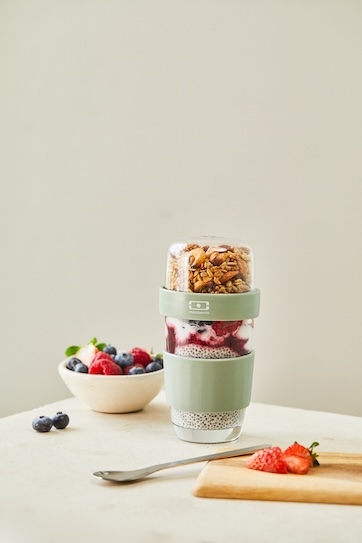 Le MB Sunny, d’une capacité de 950 ml, adopte une forme bol destinée aux plats complets, salades ou recettes à assembler. Il est livré avec un pain de glace, un plateau supérieur amovible et un pot à sauce. Le MB Duo Sweet, format vertical à deux compartiments, est davantage dédié au petit-déjeuner et aux collations, avec une séparation entre base lactée, fruits ou céréales. La promesse ? Un usage pratique, transportable et réutilisable.
