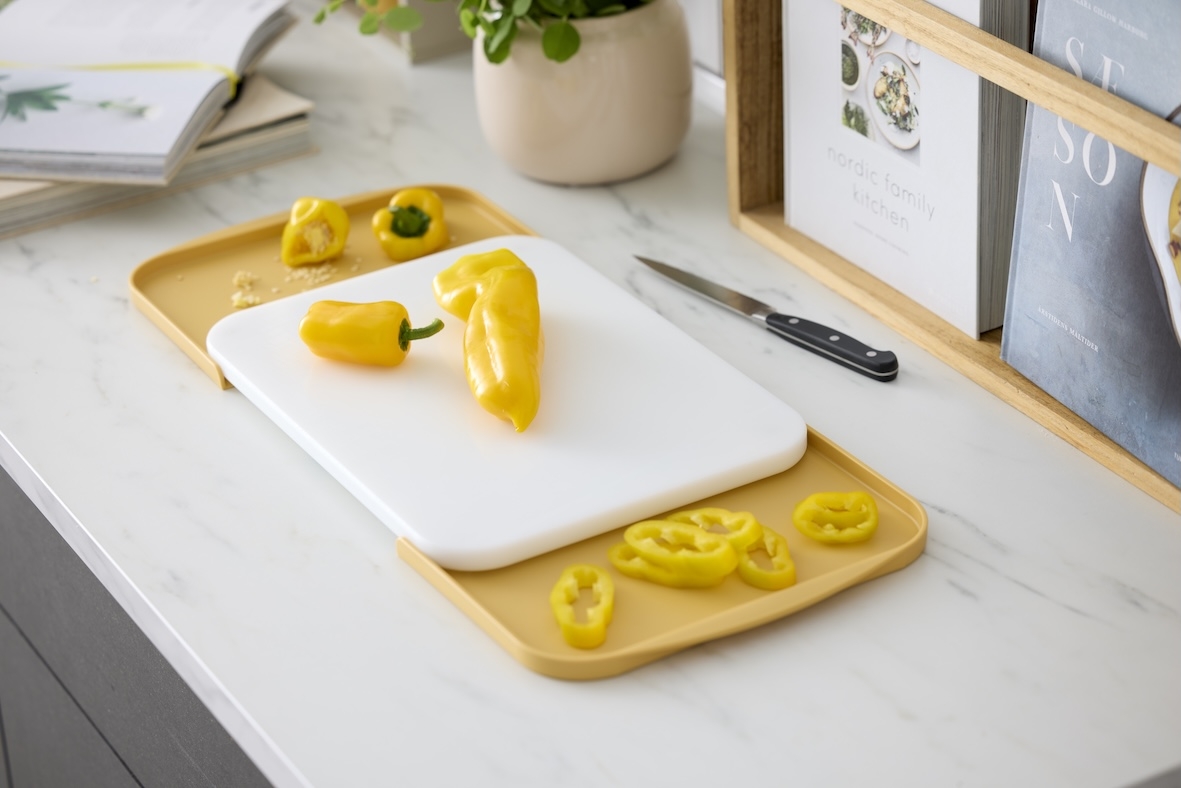 Couper, trier, organiser : autant d’actions sans cesse effectuées en cuisine. Rosti a donc imaginé Separa, un ensemble simple et conçu pour les cuisiniers amateurs, qui fluidifie la préparation et réduit les manipulations en permettant de faire glisser les déchet sur la gauche, et de placer les aliments fraichement coupés à droite.
