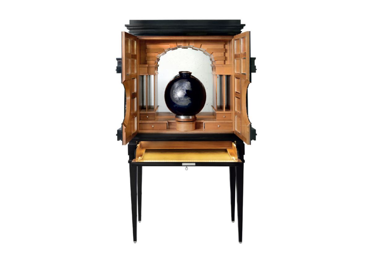 La maison Taillardat, spécialisée dans le mobilier classique, s’est associée avec les Emaux de Longwy pour réaliser Hypnos, un cabinet en bois de poirier et aux pieds en or blanc.