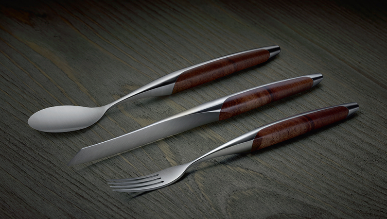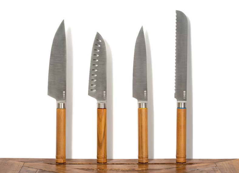 Leur lame lisse pleine soie est montée sur un manche poli à la main, décliné en quatre essences de bois : olivier, érable fumé, bocote et chêne vert aux nuances chaleureuses. Prix public : 89 € pour le set aux manches en olivier ; 96 € pour les autres essences de bois.