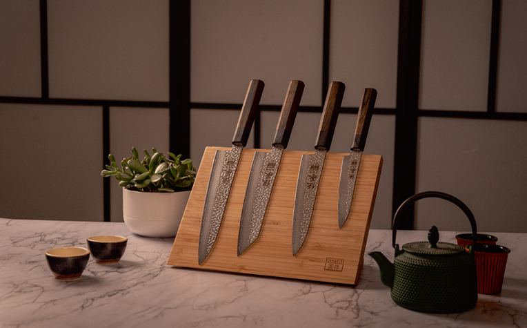 Avec sa lame en acier VG-10 (HRC 61), son manche octogonal en bois de pakka avec demi-soie et insert métallique, et sa finition martelée et damassée, la collection Densho (« héritage ») s’ancre quant à elle davantage dans l’esthétique japonaise. Pensé pour les professionnels et les passionnés, cet objet conserve durablement son tranchant, sous réserve d'un entretien adapté. Prix public à partir de 220 €.
