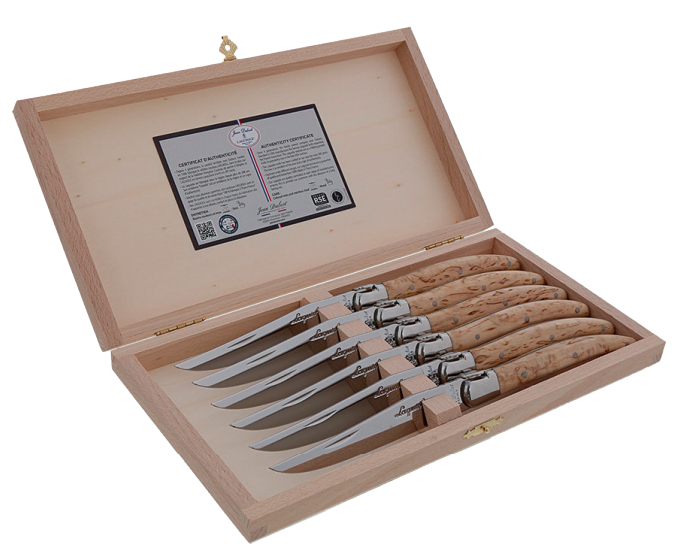 Jean Dubost a en outre lancé cet été une collection dotée de manches en bouleau de Norvège, un bois clair et élégant dont les madrures sont dues à l’effet du gel lors des montées de sève printanières. Parmi les nouveautés, un coffret de six couteaux de table Jean Dubost Laguiole à la lame en acier inoxydable finition poli miroir (épaisseur 2,5 mm). Le couteau Le Poche Jean Dubost arbore les mêmes caractéristiques avec une lame en acier inoxydable AISI420 finition satinée (2,5 mm), l’abeille emblématique et un étui en lin français upcyclé, présenté dans un coffret bois.