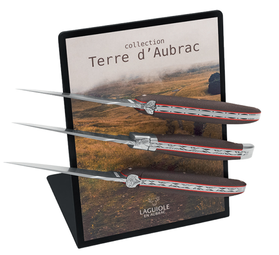 Avec la collection Terre d’Aubrac, c’est un fragment de ce haut plateau volcanique que la marque Laguiole en Aubrac propose d’emporter avec soi. Chaque couteau pliant est en effet façonné à partir de terre de l’Aubrac, transformée pour créer une nouvelle matière au toucher minéral légèrement rugueux et à la teinte sombre ponctuée de grains plus clairs et rougeoyants en clin d’œil au feu des volcans. Trois modèles à lame 12 cm sont proposés : une pièce deux mitres inox, et plein manche mouche Aubrac ou jonquille. Prix publics : de 202 € à 304 €.