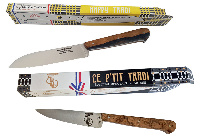 Cette aventure coutelière se poursuit avec Magali, petite-fille des fondateurs, et Vincent Soucille qui ont notamment imaginé à l'occasion des 50 ans de Goyon-Chazeau un couteau en édition limitée à 400 exemplaires dans la gamme P'tit Tradi : une série numérotée au manche en loupe de frêne provenant du terrain familial, à la lame gravée 50 ans, emballé dans un packaging arborant un logo anniversaire (prix public : 59,90 €).