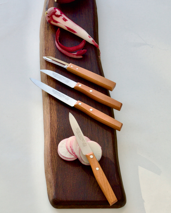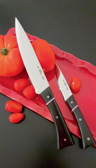 Sa particularité : le manche de forme ronde, fabriqué en Bretagne, en merisier vernis, choisi pour son origine française ainsi que pour sa teinte et ses nervures irrégulières qui confèrent à chaque pièce un caractère unique. Découpées, assemblées et affûtées à Thiers, les lames sont en acier Nitrox (acier inoxydable HRC 56). Prix publics : à partir de 150 €.