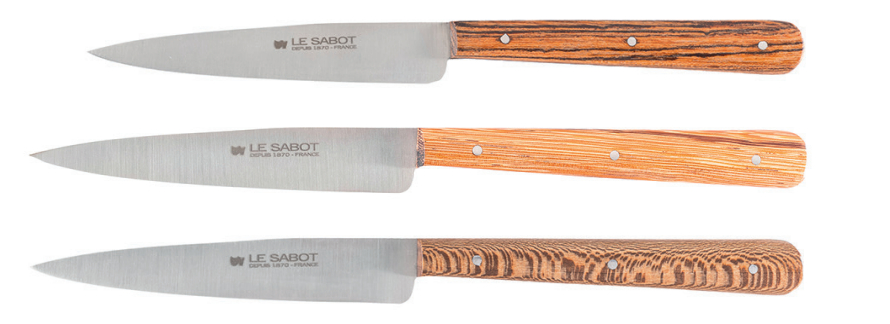 La gamme Tradi se décline aussi en set de trois couteaux : trio Tradi (P’tit, Grand, Happy) noyer, ébène aubier ou olivier. Prix public : 164,90 €.