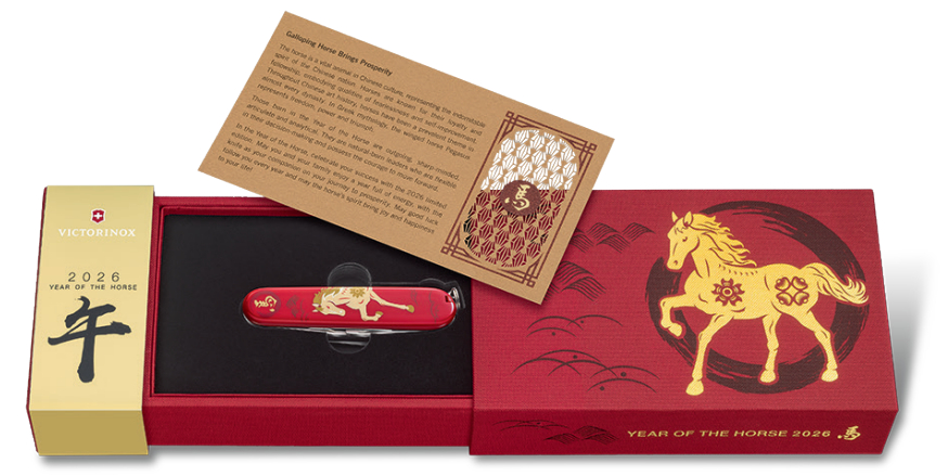 Le Companion est quant à lui un couteau de poche suisse polyvalent muni de 16 fonctions, dont un ouvre-emballage, une lime à ongles et des ciseaux.Déclinaisons : cellidor rouge pour le Companion, rouge, or et argent pour le Companion S Alox, le Companion X Alox et le Companion Slim Alox.Au rang des éditions limitées, Victorinox reste fidèle à ses rendez-vous traditionnels, avec deux lancements cet automne : le Winter Magic Limited Edition 2025 (10 000 pièces) doté de côtes en bois de poiriers ornées d’un arbre gravé au laser, et de 12 fonctions ; et le Huntsman Year of the Horse 2026 (8 888 pièces numérotées ; 6 fonctions), clin d’œil à l’astrologie chinoise et à l'année du cheval célébrée le 17 février 2026.