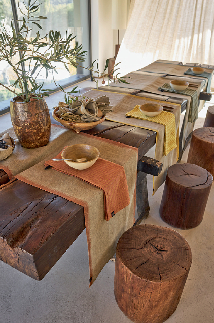 Les nappes et les chemins de table en lin lavé forment désormais un vocabulaire tactile et parfois un habillage intégral, apportant de la douceur, de la couleur et du confort.