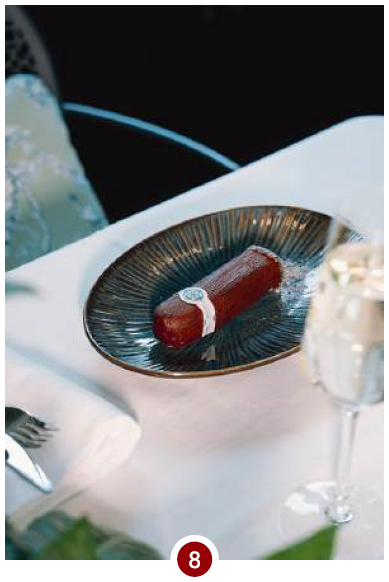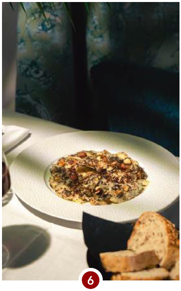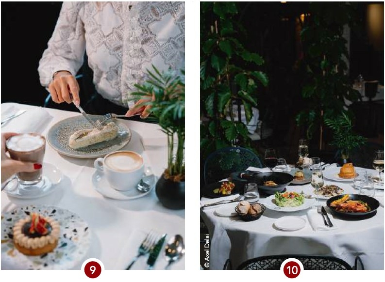 Le choix s'est notamment porté sur de la vaisselle noire, signée RAK Porcelain, qui s'accorde à l'atmosphère enveloppante du jardin d’hiver. L'assiette d’attente, également fabriquée par RAK Porcelain, a été sélectionnée pour son motif ressemblant à la mosaïque du sol du restaurant (photo 9), tissant un lien visuel entre la salle et la table. L'assiette à pain imaginée par Bernardaud, blanche et épurée, ajoute une touche intemporelle. La porcelaine est en effet omniprésente, privilégiée pour son caractère durable et élégant.