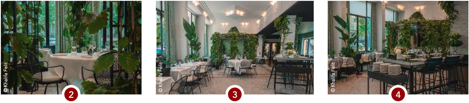 Une parenthèse florale et végétale dans l'ouest parisien, baignée de lumière, où les textures, les couleurs et les matières composent un univers élaboré dans les moindres détails par le chef Tony Goncalves et Cédric Doux, directeur de la restauration.