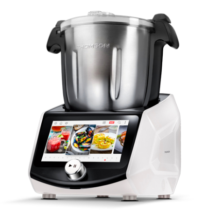 Robot connecté multifonction ultra compact i-Genimix de Thomson. Température ajustable de 37° à 120°C, écran 7 pouces, 8 programmes automatiques (mijoter, battre, hacher, cuire à la vapeur, mélanger, saisir, moudre, émulsionner, mixer, pétrir, râper des légumes, cuire). Livré avec 500 recettes intégrées, et 10 nouvelles recettes chaque mois à télécharger. En exclusivité dans les magasins Carrefour depuis le 8 juin.