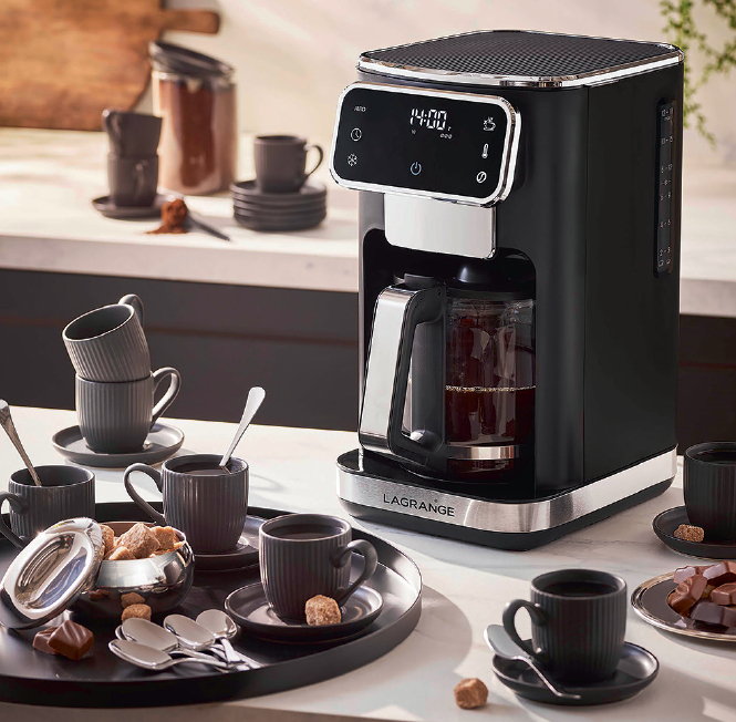 Livrée avec un filtre permanent en nylon réutilisable. Parmi les autres fonctionnalités : départ différé 24 heures, maintien au chaud 30 minutes, fonction café glacé. Prix public : 99 €. Cet appareil complète la gamme Naos de Lagrange qui comporte une bouilloire programmable (1,7 l), un presse-agrume et un grille-pain.