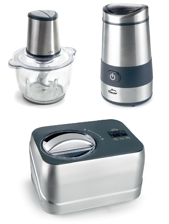 Prix public : 50 €. Autre référence, le hachoir électrique Picadora Quartz, décliné avec bol en verre de 1,2 l ou 2 l, se distingue par sa robustesse grâce à sa tête en inox, des lames renforcées et ses engrenages métalliques. Prix public : 55 €. Petit format toujours avec la machine à glaces Icy capable de préparer 1 l de crème glacée maison sans passage au congélateur grâce à son compresseur autorefroidissant. Prix public : 275 €.