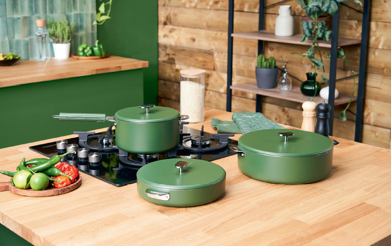 Fidèle à son ADN, la marque Greenpan continue quant à elle de déployer son revêtement céramique Thermolon, comme sur la collection Evolution, en faisant valoir le caractère 100 % recyclé de son corps en aluminium et la possibilité de démonter la poignée pour faciliter le recyclage des différentes pièces la composant.